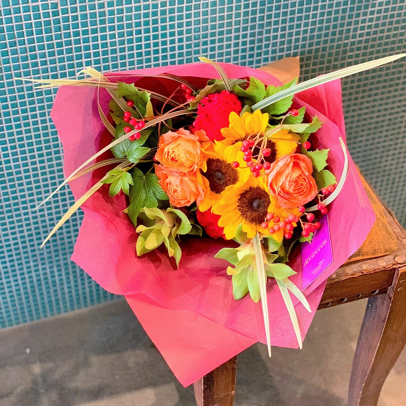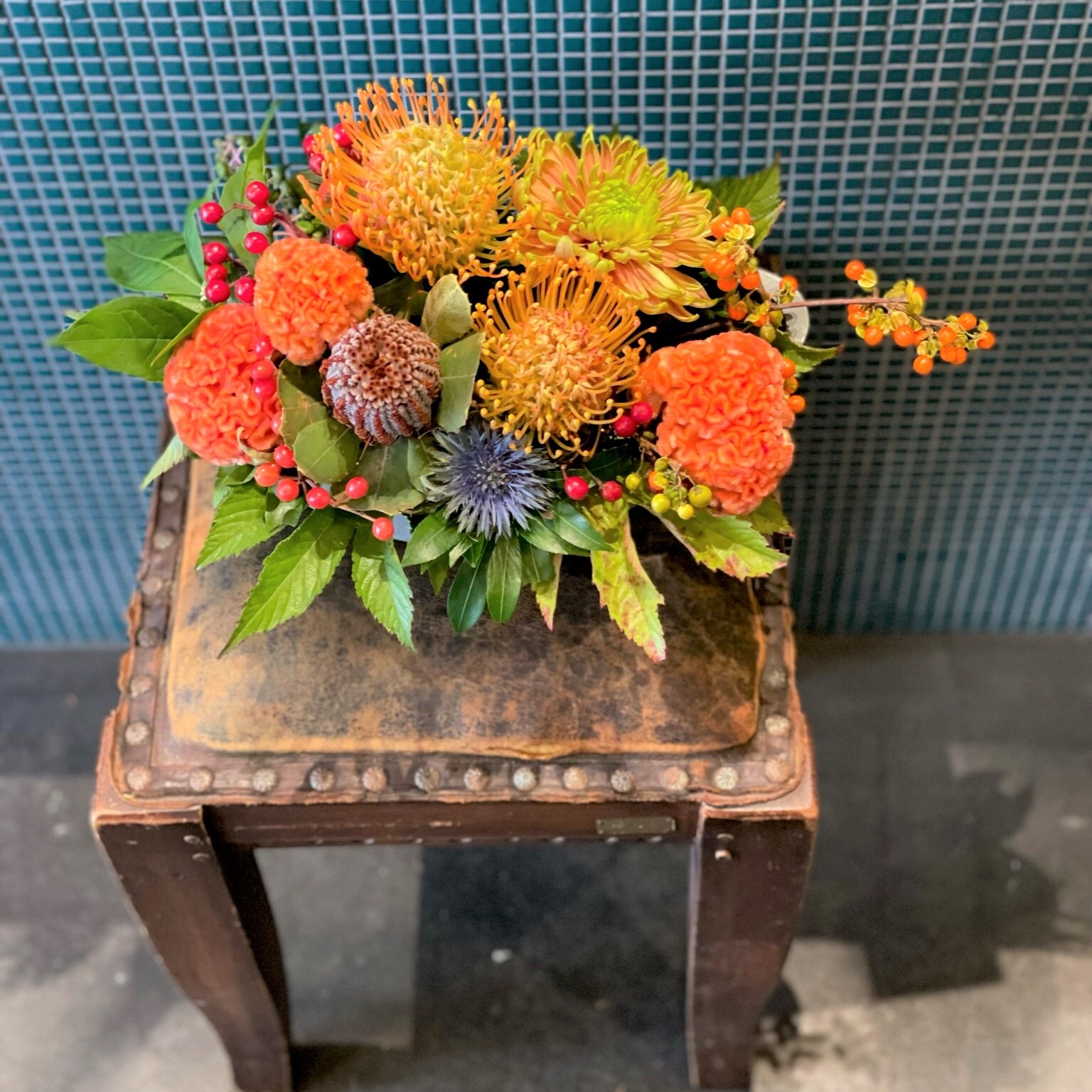 夜長にそっと灯る、しっとり和モダンの秋花。気品ある菊に、南天・野ばら・紫式部の実もの、景色を結ぶ蔓を添えて、実りと長寿を寿ぐ一束に。玄関・受付・客席に凛と映えるアレンジから、敬老の贈り物にふさわしいブーケまで。色は「からし(琥珀)・えんじ・オリーブ・墨色」。
