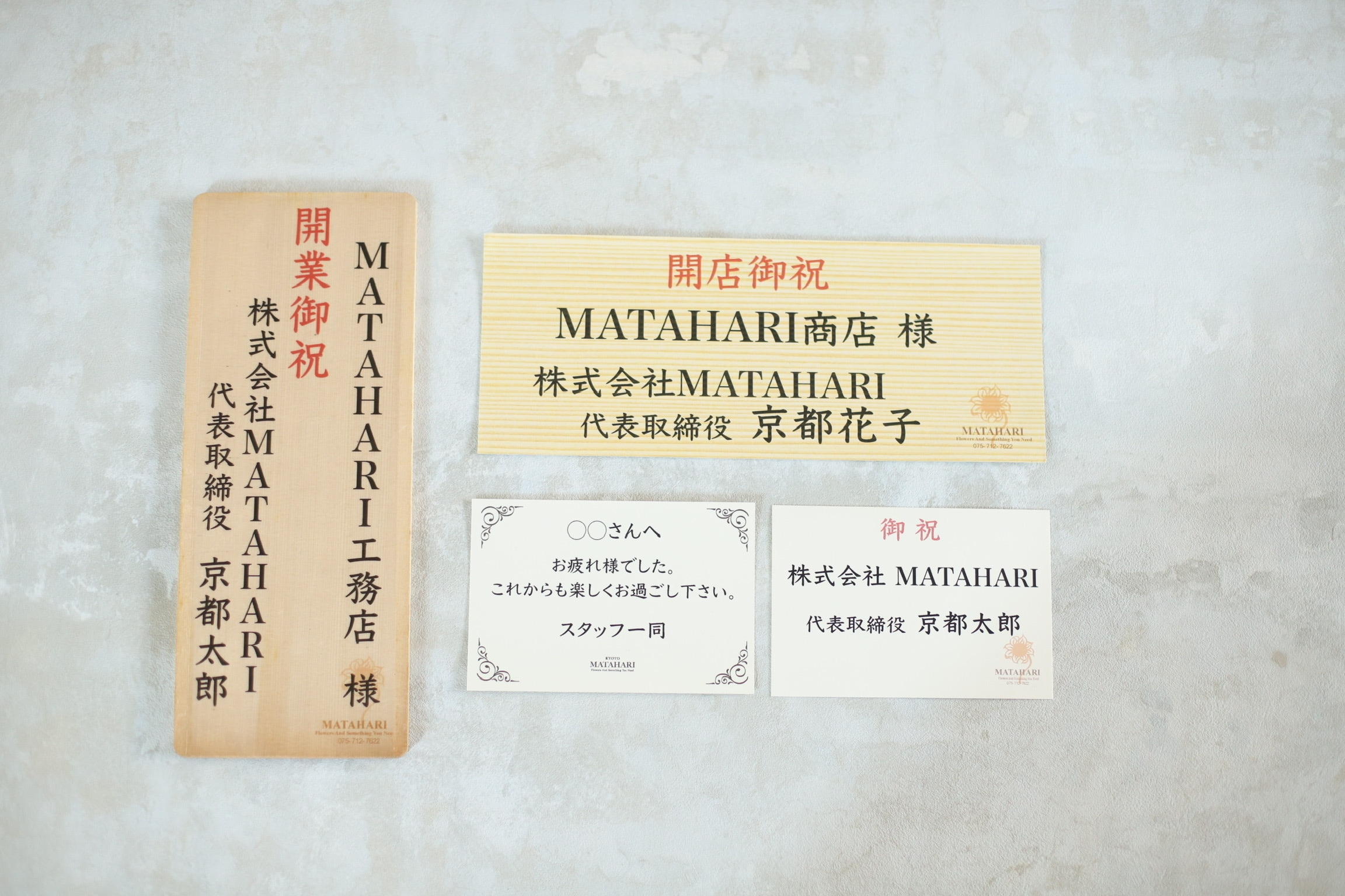 お花に添える「立て札」と「メッセージカード」は、それぞれ異なる目的やシーンで使用されます。MATAHARIでは用途に応じて適切にお選びいただけるよう、どちらもご用意しております。立て札は開店開店・開業祝い、就任祝い、葬儀・法要などのフォーマルなシーンで使われ、主に企業向けにお花を贈る時に使われます。 メッセージカードは誕生日、記念日、感謝の気持ちを伝えるなど、個人的でカジュアルなシーンに使われ、贈り主の想いや気持ちを、文章で直接伝えることができます。