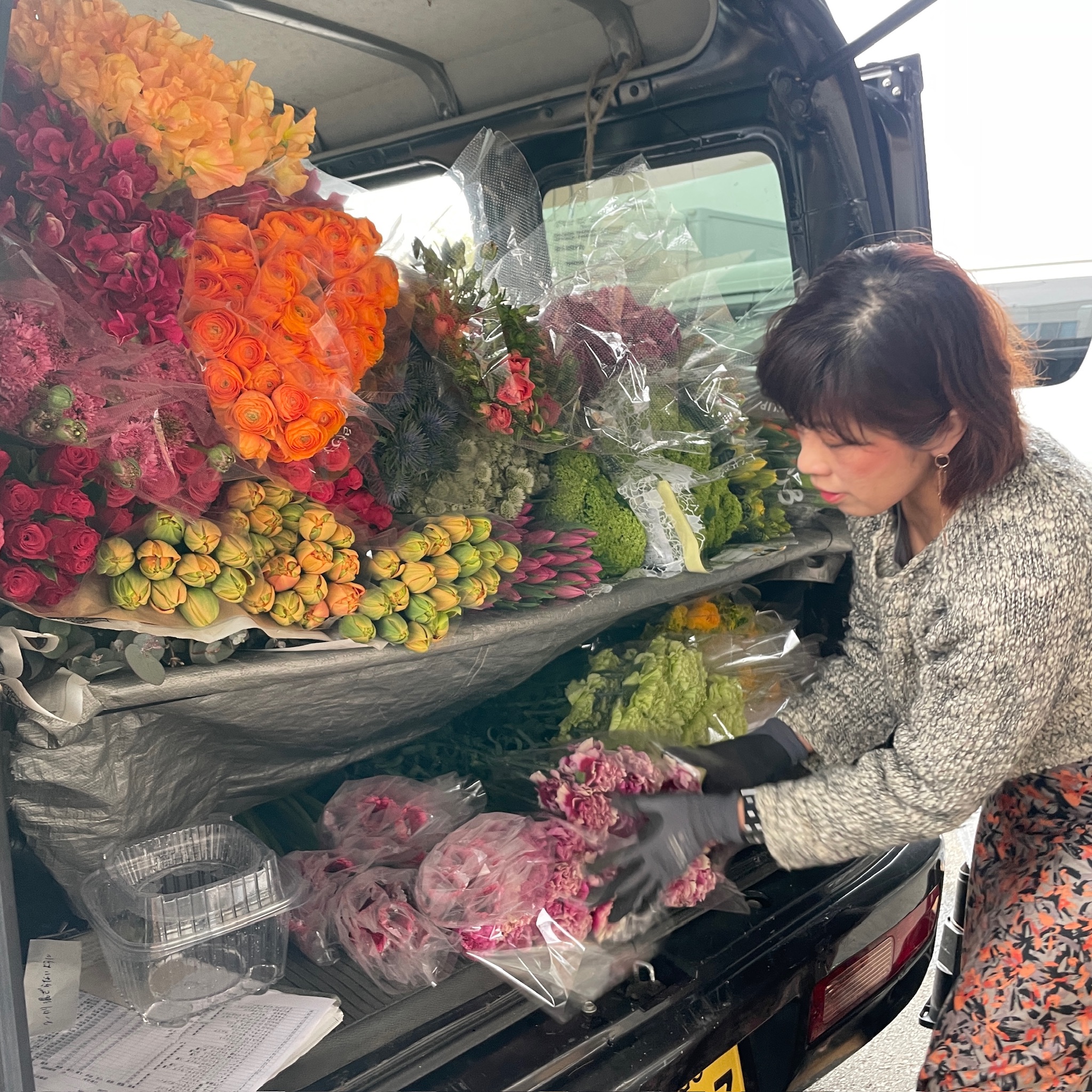 花束やアレンジメント作りは、まず「花選び」から始まります。仕入れは花屋にとって最も大切な仕事のひとつ。市場へ向かい、同じ種類の花でも産地や生産者ごとに違う色合いや形、鮮度を見極めながら、慎重に選びます。