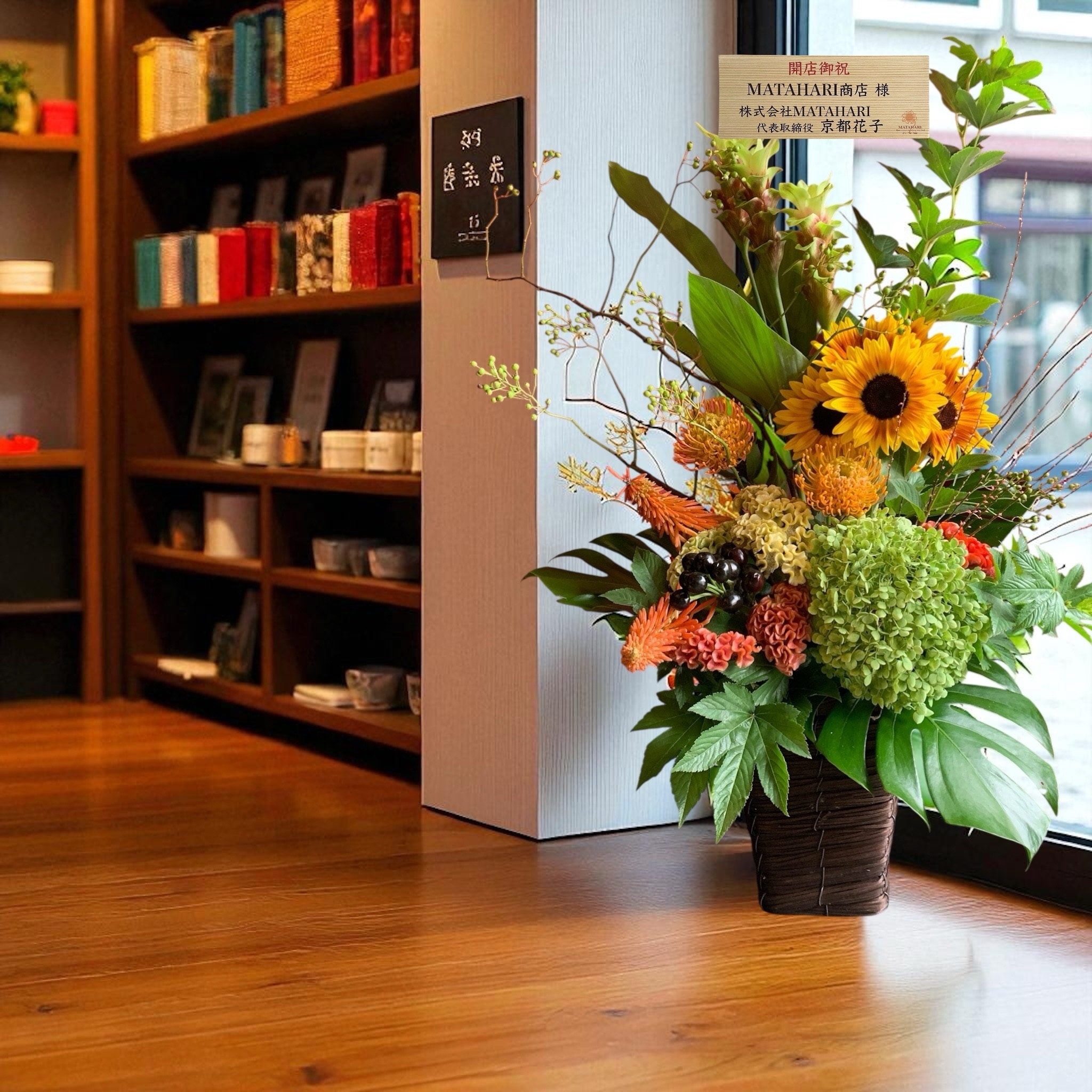 MATAHARIでは、アレンジメントを「縦型」と「横型」の2種類ご用意しています。用途や設置場所に合わせてお選びいただけます。縦型アレンジメントは、レストランやショップ、イベント会場、オフィスなど、格式あるお祝いの席にもふさわしい華やかさを備えています。お花が多く届く空間や、飾るスペースが限られている場合でも、高さを活かしたデザインにより上方向にボリュームを出し、限られた面積でも存在感を放ちます。さらに、自立して床に置けるため、エントランスやロビーなどの広い空間にも優美に映えます。