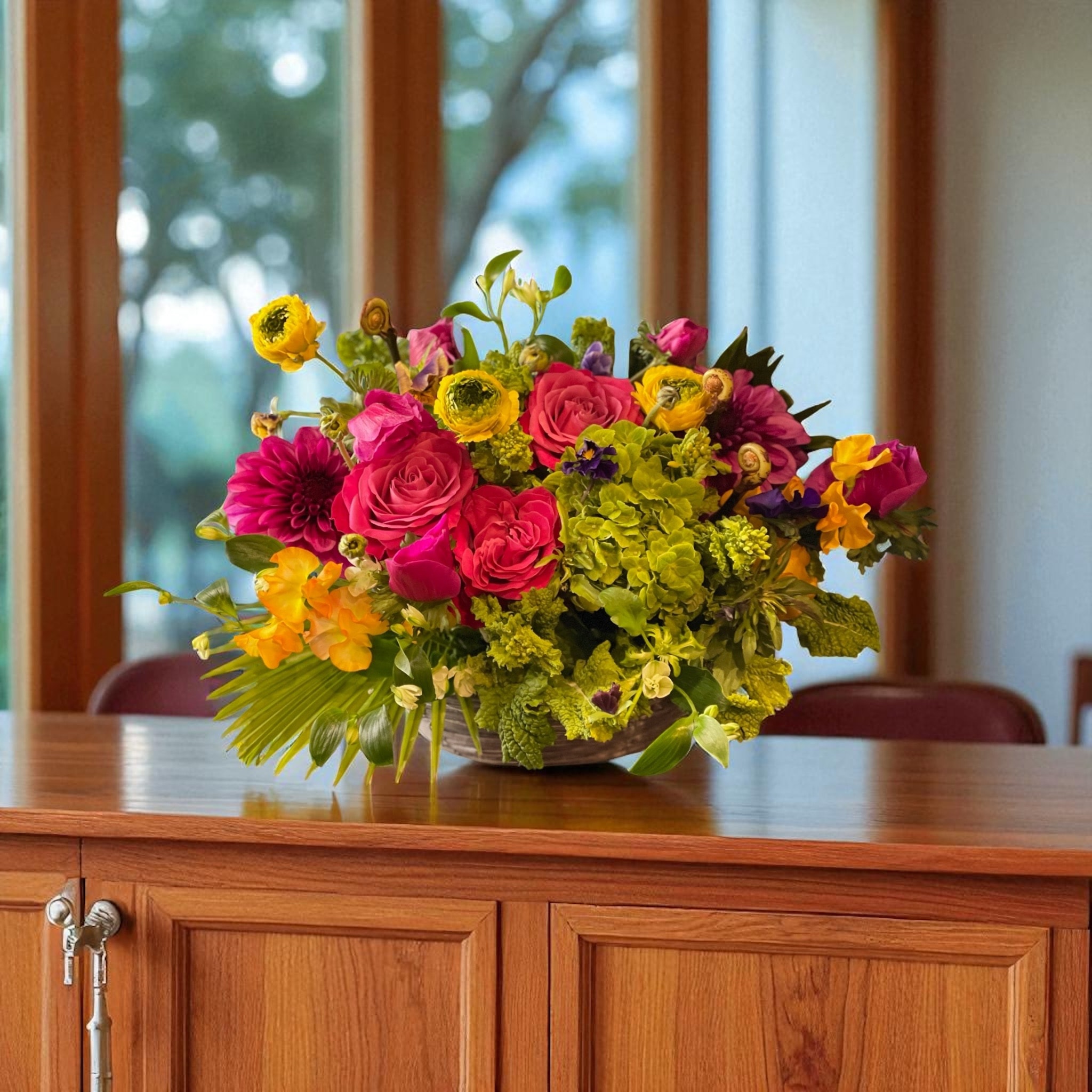 横型アレンジメントは、ホテルのフロントや受付カウンター、レストランのテーブル、パーティー会場のウェルカムスペースなど、横に広がるスペースでの装飾に最適です。低めで横に広がるデザインは、視界を遮らず、テーブル越しの会話や接客を妨げません。空間全体をやわらかく彩り、落ち着きや温かみを演出します。また、ご家庭の玄関やリビングボード、棚の上などにも飾りやすく、日常の空間にも上質な華やかさを添えられます。