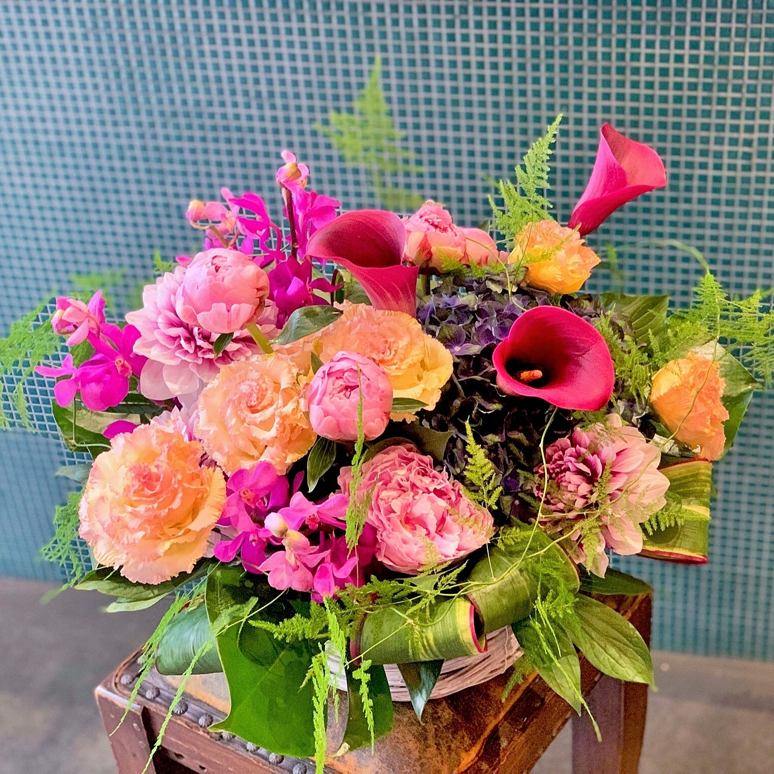 MATAHARIでは、アレンジメントを「縦型」と「横型」の2種類ご用意しています。用途や設置場所に合わせてお選びいただけます。縦型アレンジメントは、レストランやショップ、イベント会場、オフィスなど、格式あるお祝いの席にもふさわしい華やかさを備えています。お花が多く届く空間や、飾るスペースが限られている場合でも、高さを活かしたデザインにより上方向にボリュームを出し、限られた面積でも存在感を放ちます。さらに、自立して床に置けるため、エントランスやロビーなどの広い空間にも優美に映えます。