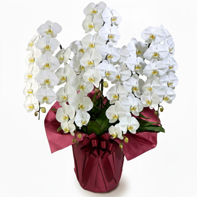 形の揃った胡蝶蘭は送った先の方へ大いに喜ばれるお花で、胡蝶蘭の白色は