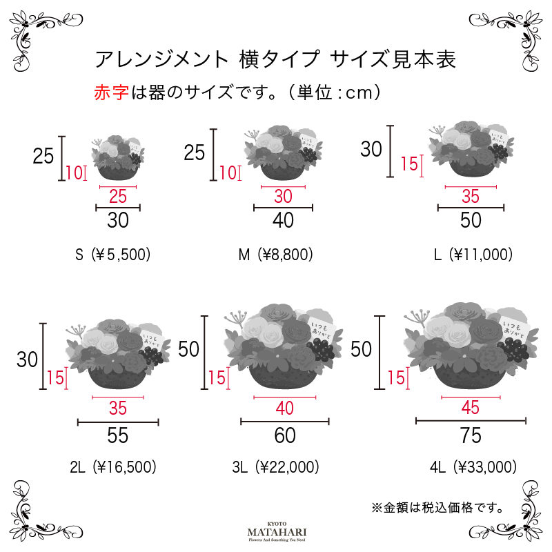 MATAHARIでは、アレンジメントを「縦型」と「横型」の2種類ご用意しています。用途や設置場所に合わせてお選びいただけます。